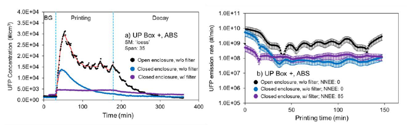 Výzkumníci zveřejnili následující grafy, které ukazují, že maximální naměřená koncetrace UFP při použití HEPA filtrace byla 5x103, což je o 90% nižší hodnota než u 3D tiskárny s otevřenou komorou.